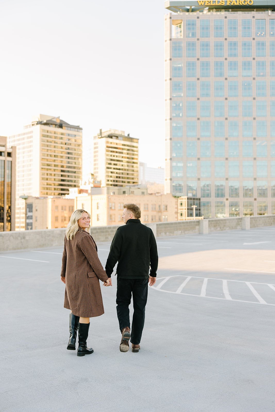 Fall is one of the best seasons for engagement photos in Salt Lake City. I recommend neutral tones with one rich fall color like rust, emerald, or deep burgundy. Comfortable shoes are helpful for walking between spots, and scheduling your session near sunset gives us soft, flattering light reflecting off the buildings.
