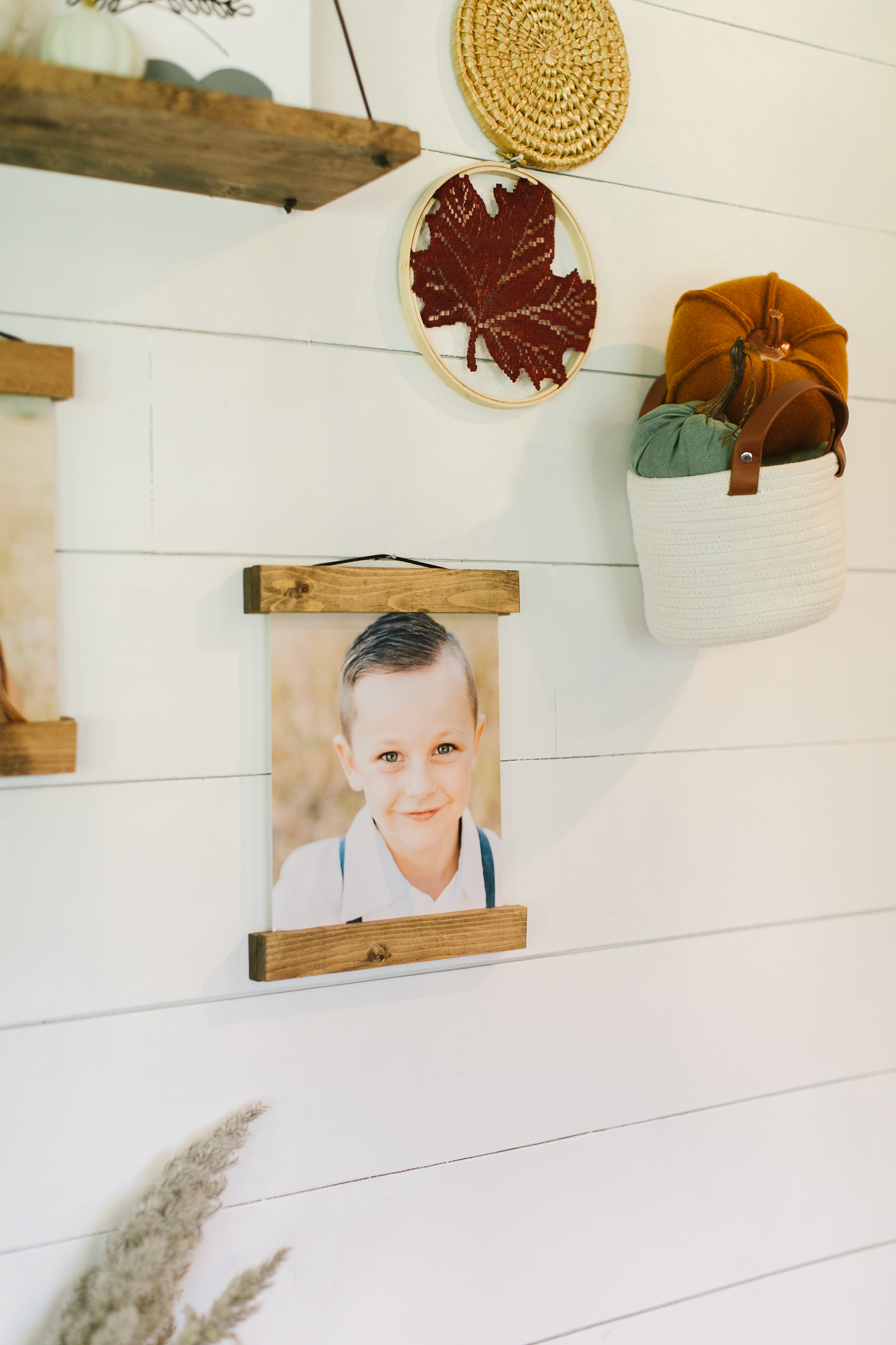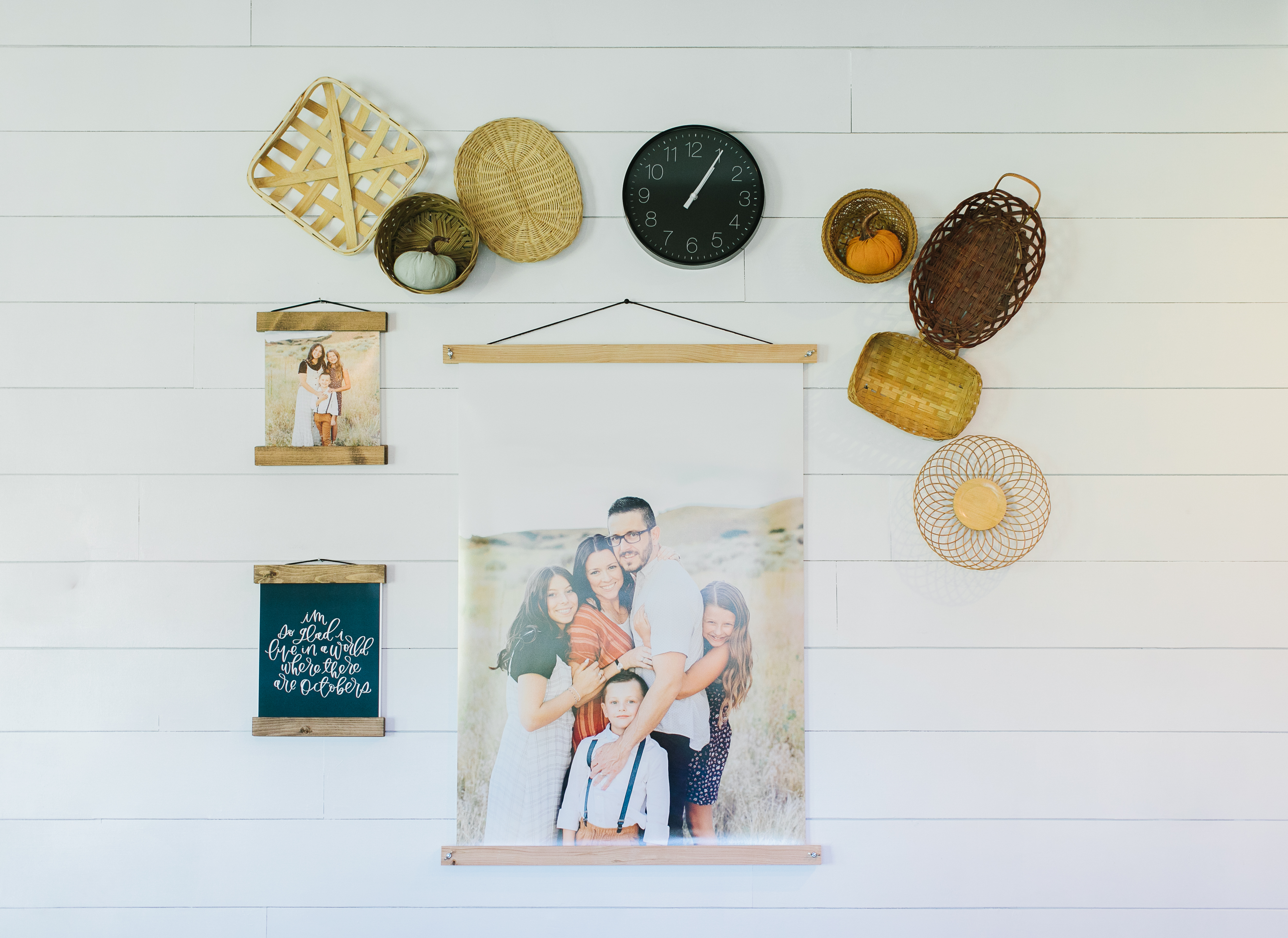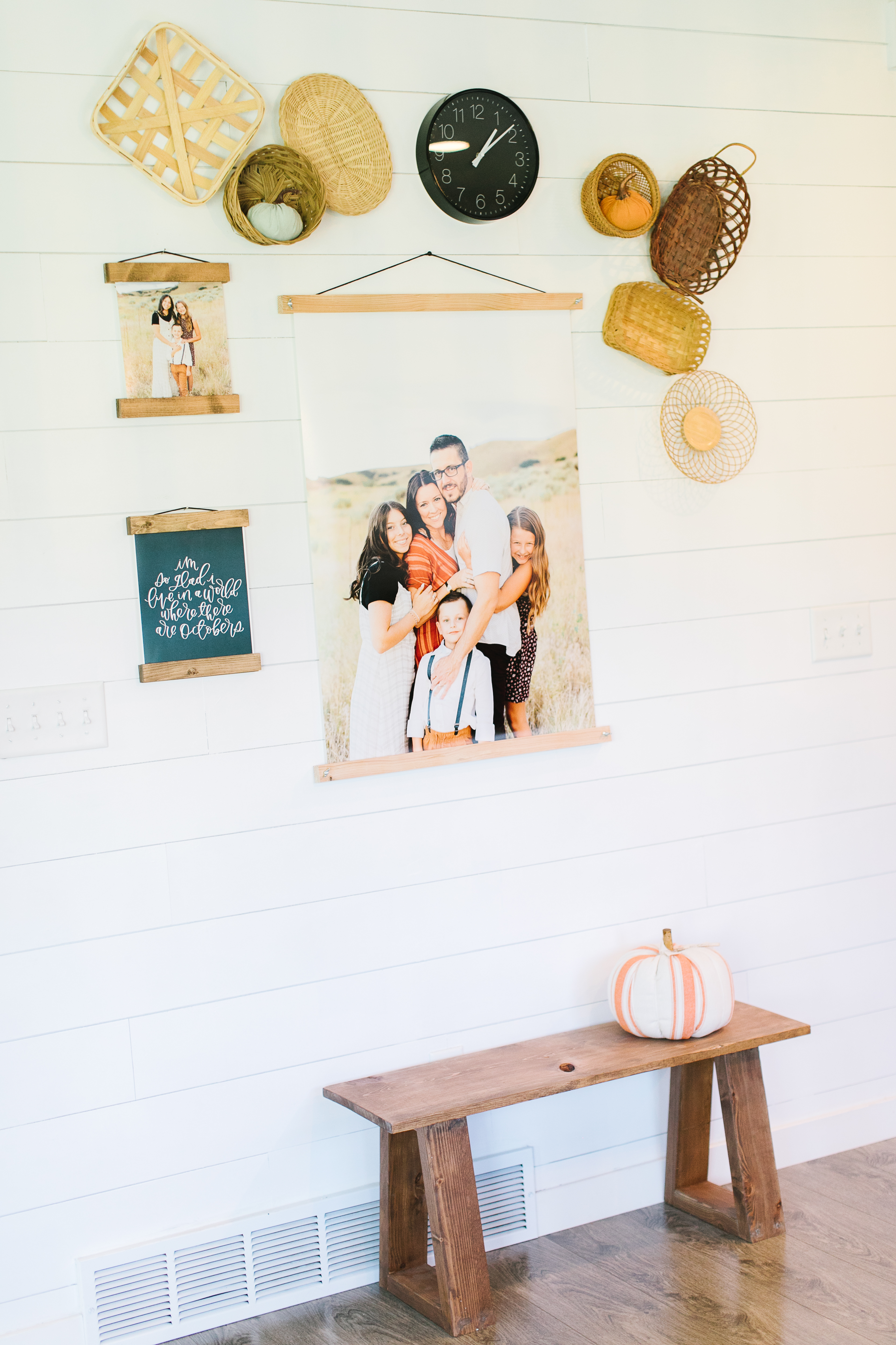 For this gallery wall, Kim styled a variety of wicker baskets, pumpkins, a print, and a couple of pictures. The main focus of this styled wall is the 24×36 family poster picture hanging with jw Paper co’s poster and magnetic wooden frames.