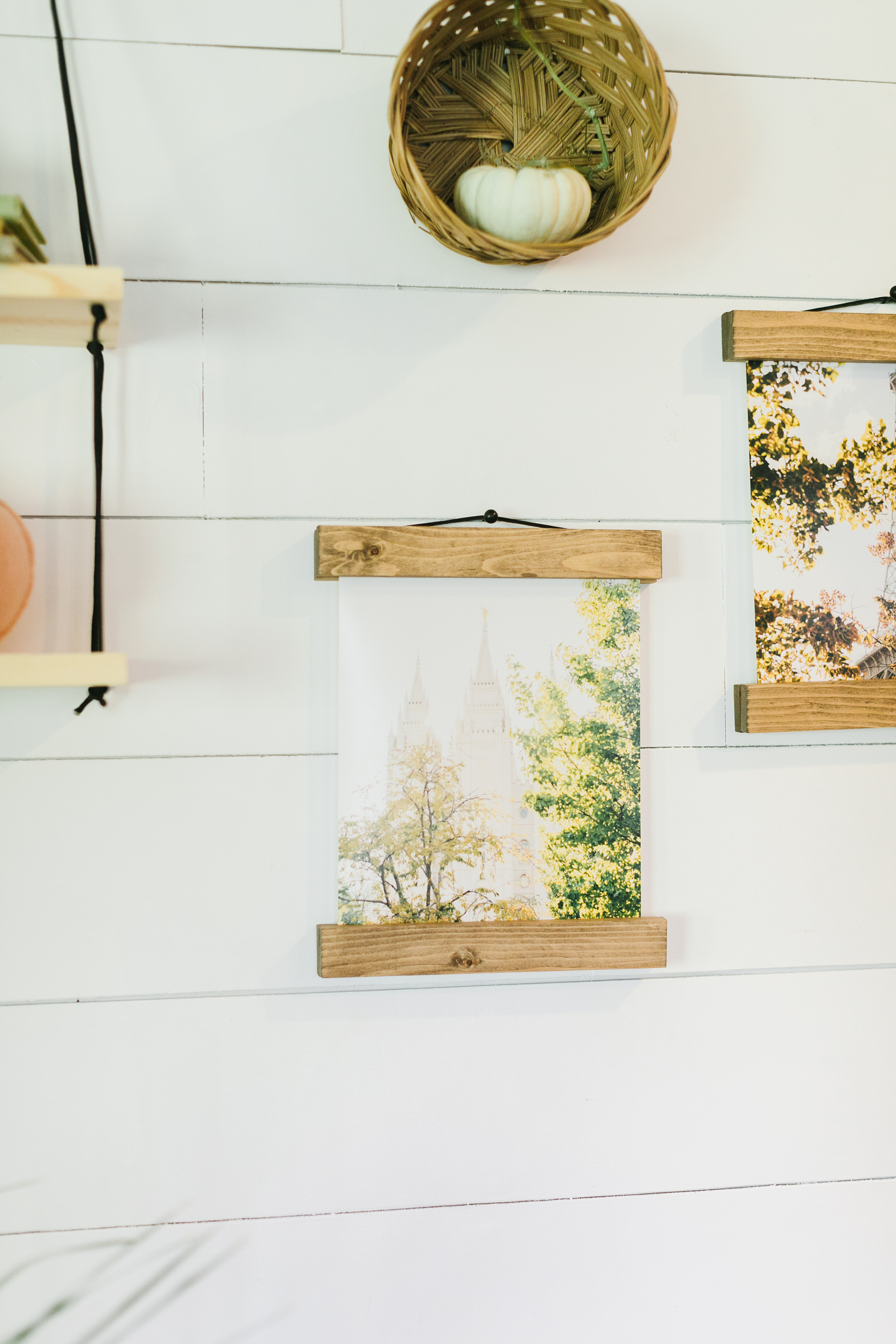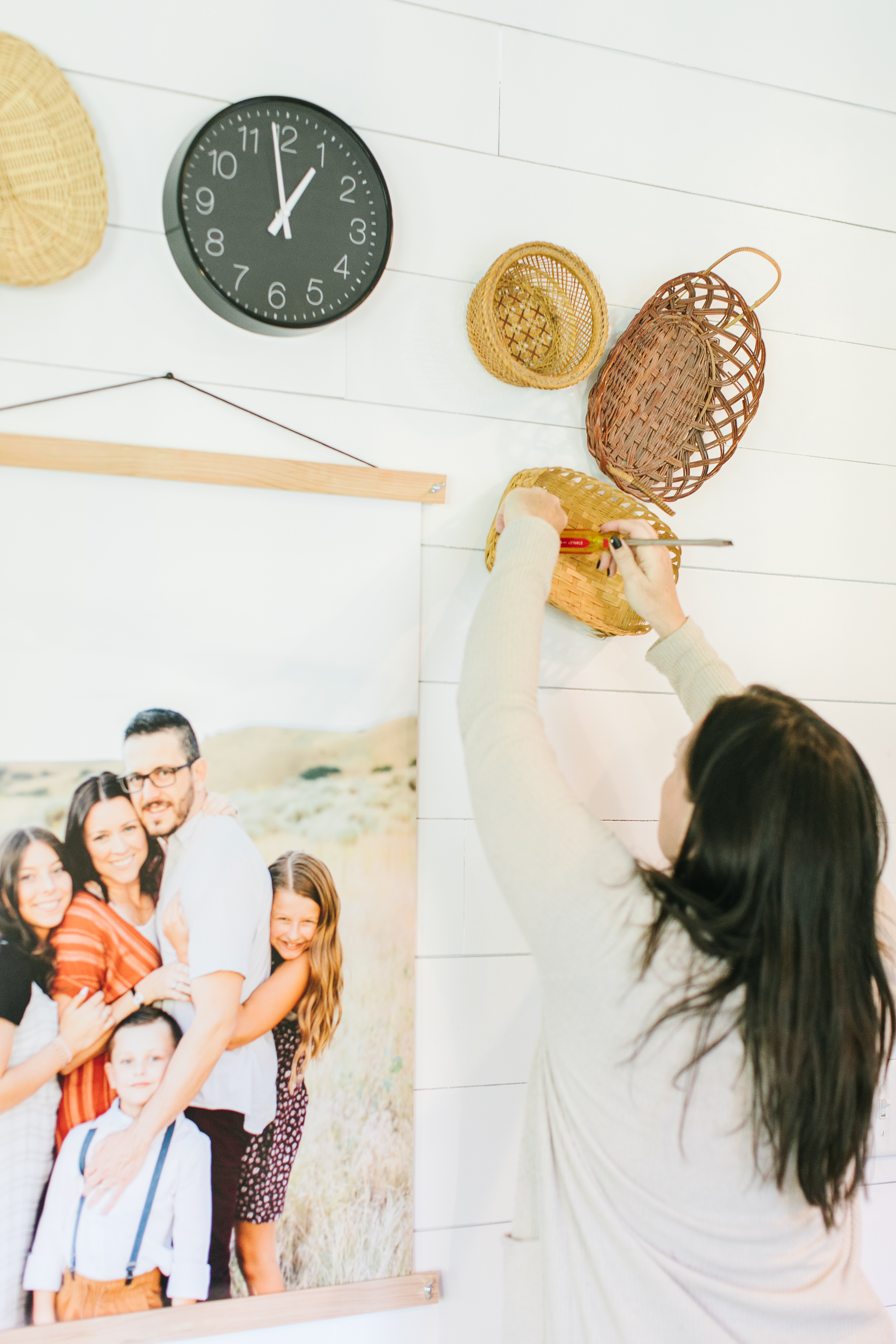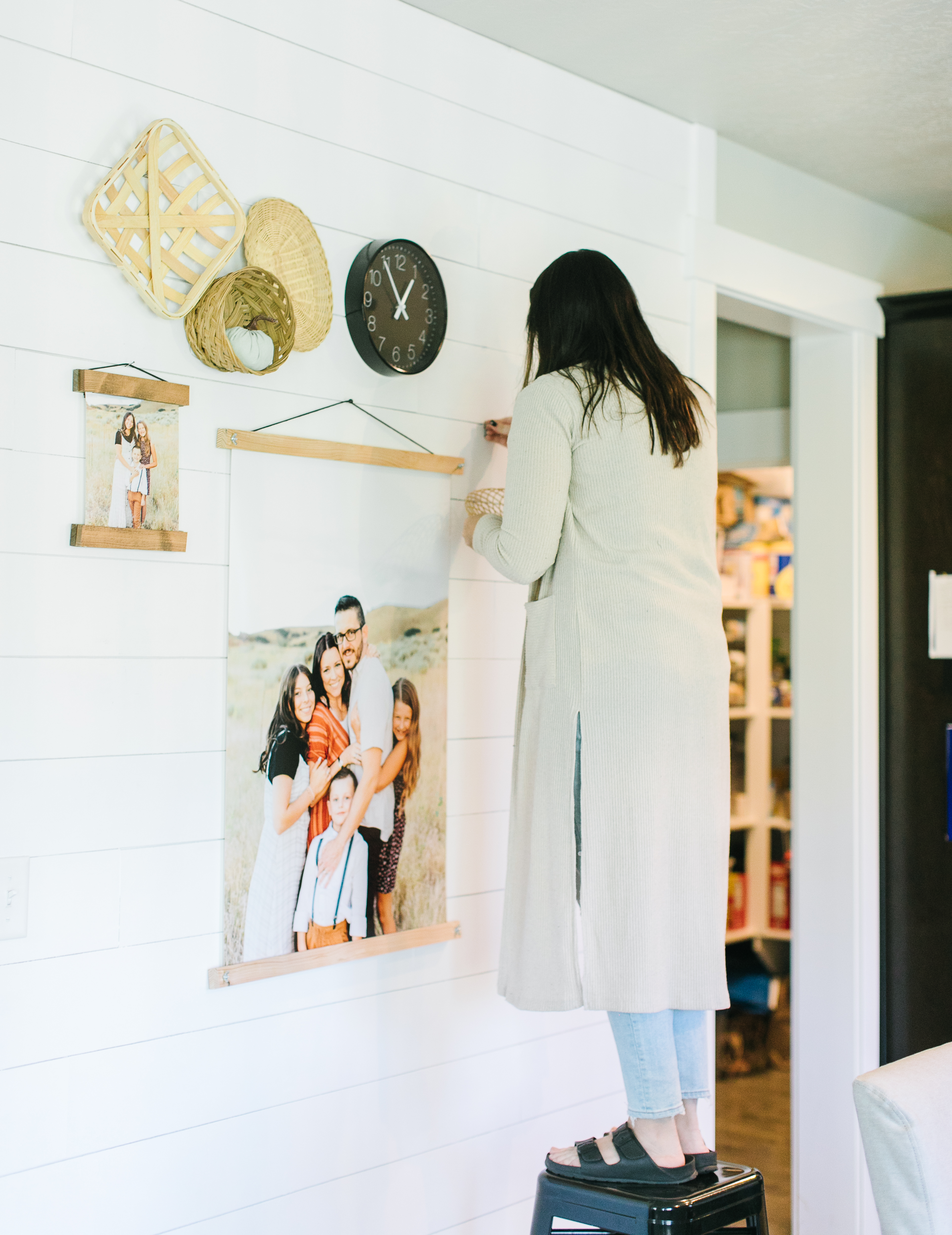 For this gallery wall, Kim styled a variety of wicker baskets, pumpkins, a print, and a couple of pictures. The main focus of this styled wall is the 24×36 family poster picture hanging with jw Paper co’s poster and magnetic wooden frames.