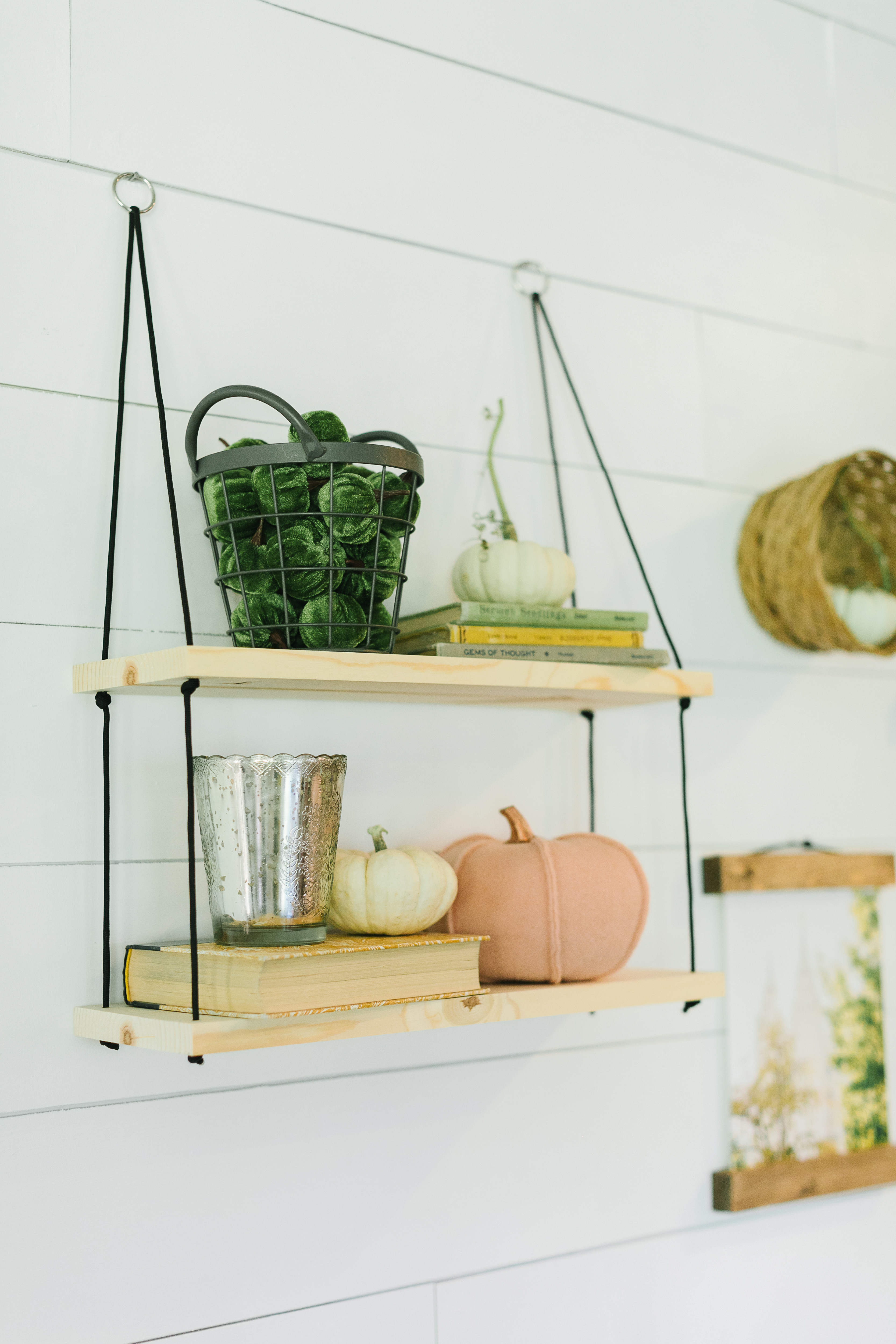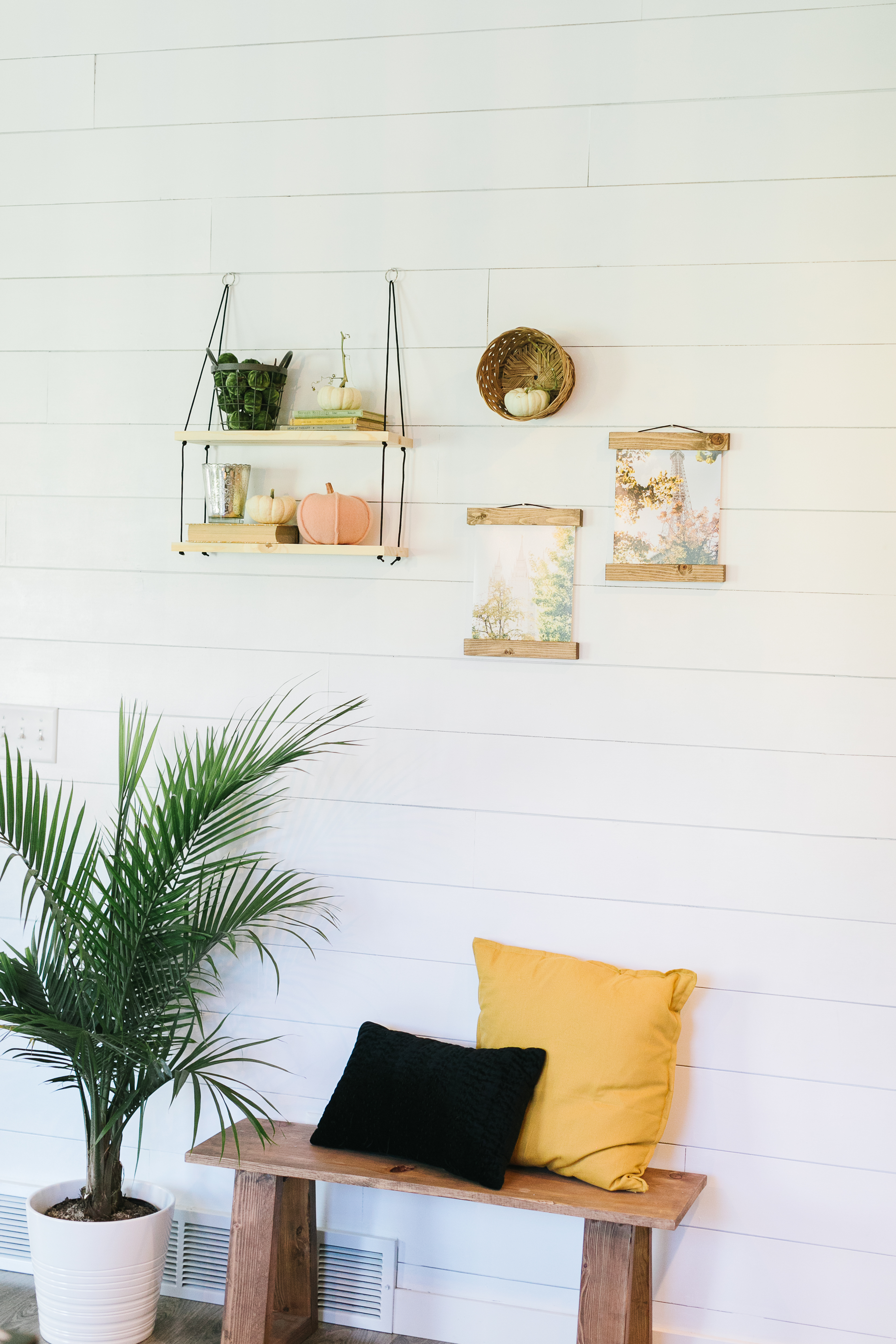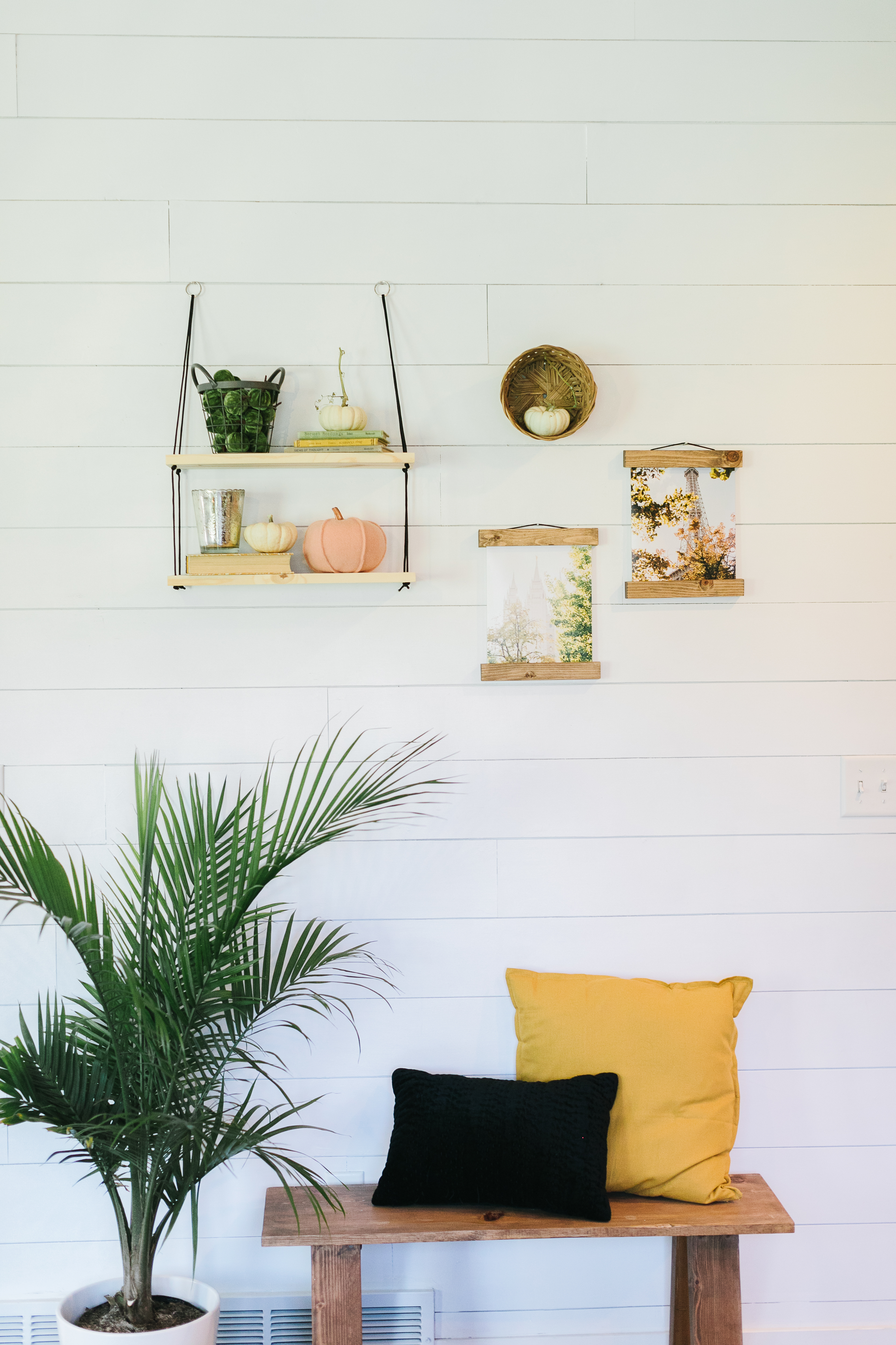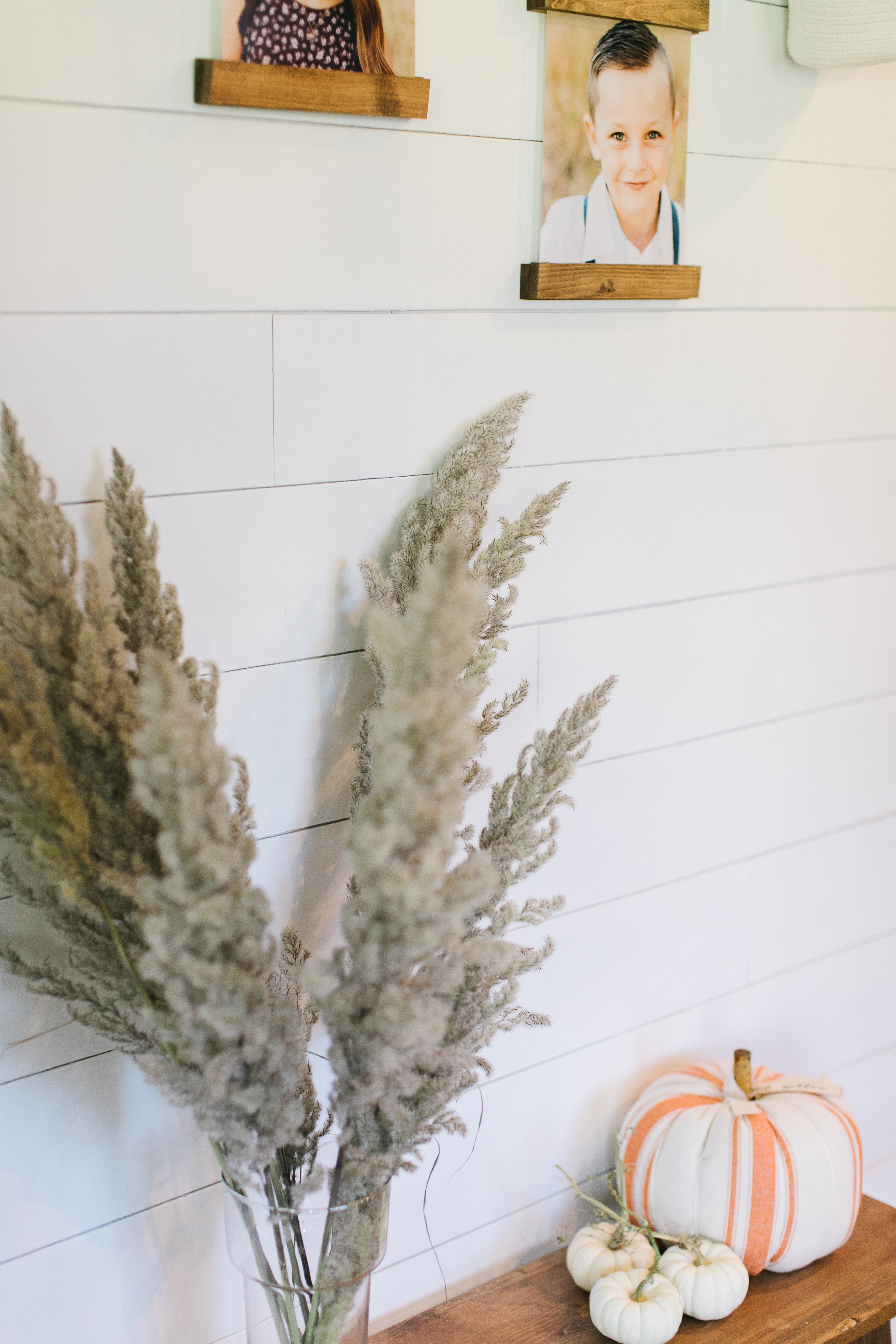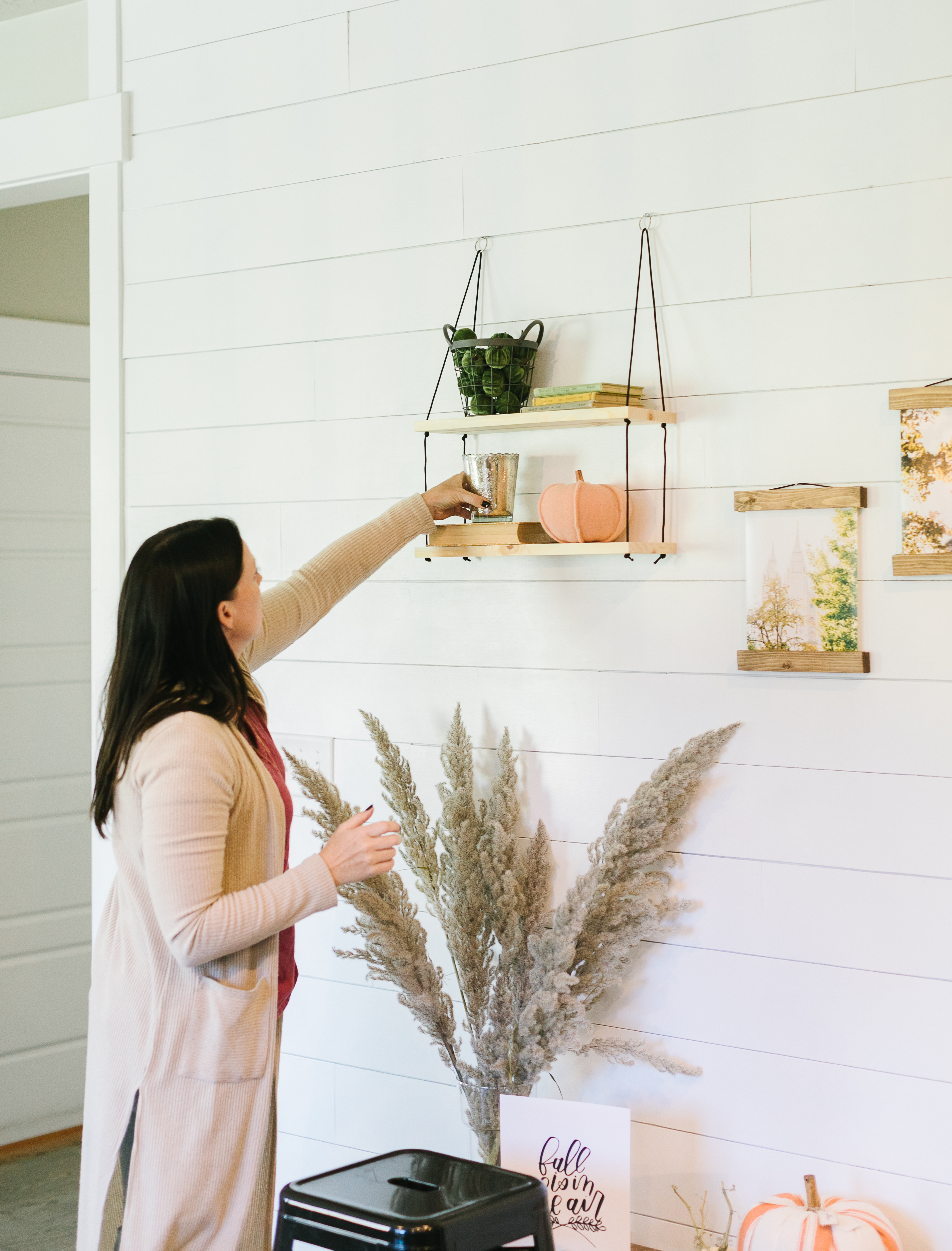 I loved this wall! This styled wall featured jw Paper co‘s hanging shelves, 8×10 magnetic frames, and a darling print. I loved how Kim incorporated the gathered cat tails and variety of pumpkins.