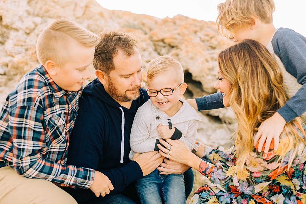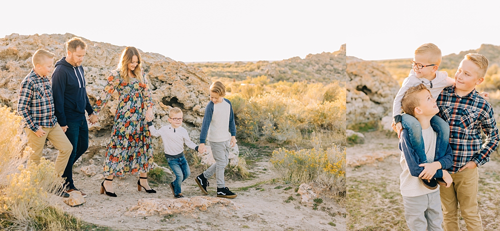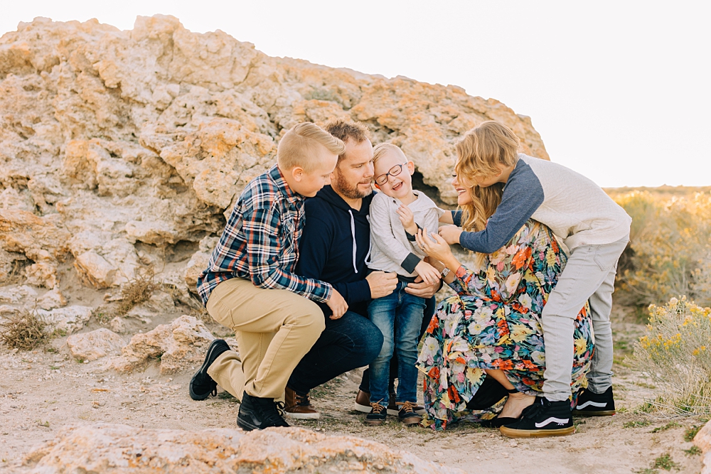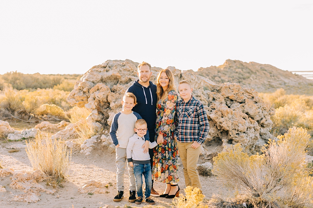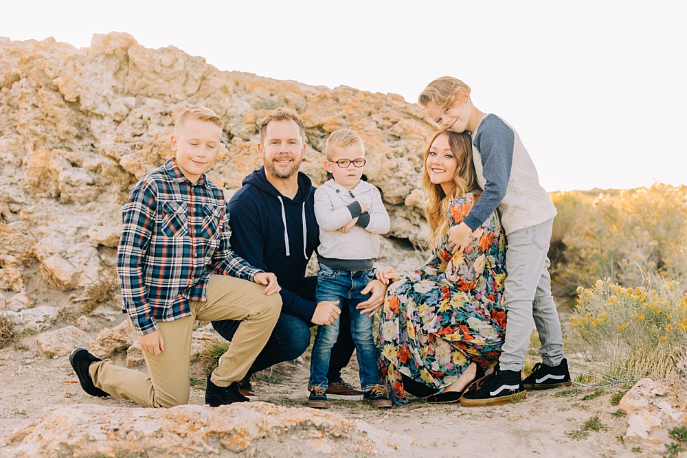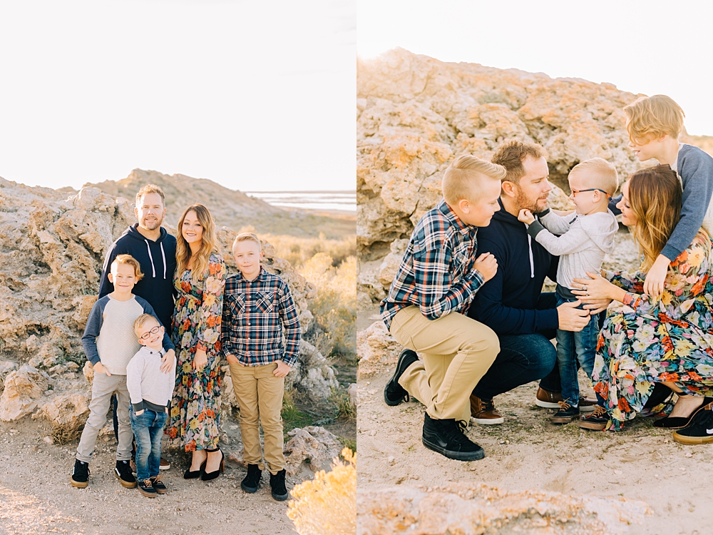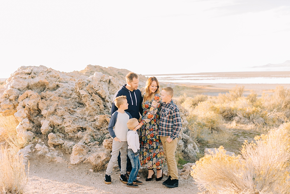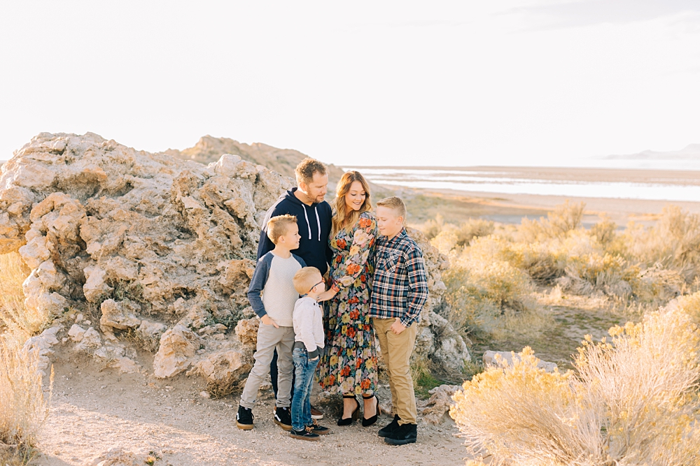 We shot this session at Lady Finger Point on Antelope Island which is right across from the visitor’s center. It’s a beautiful trailhead with parking, picnic benches, and bathrooms. But, we come for the rocks and the light. This look just can’t be beat and is the best substitute we have for beaches in Utah. Isn’t it stunning?