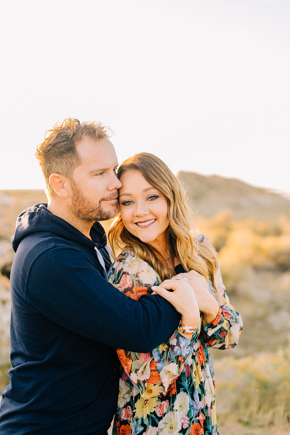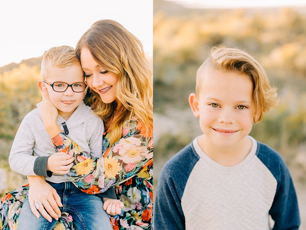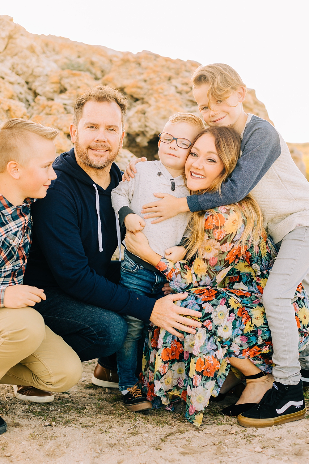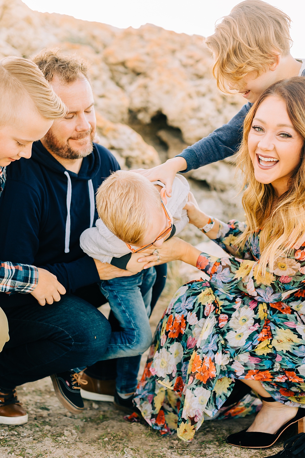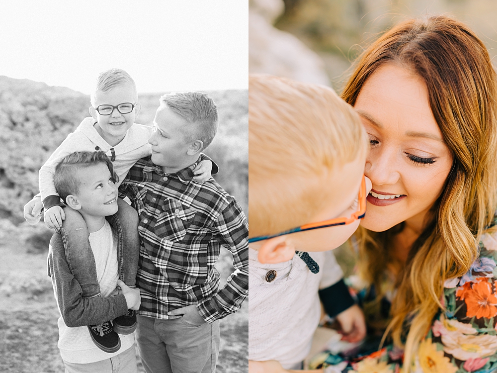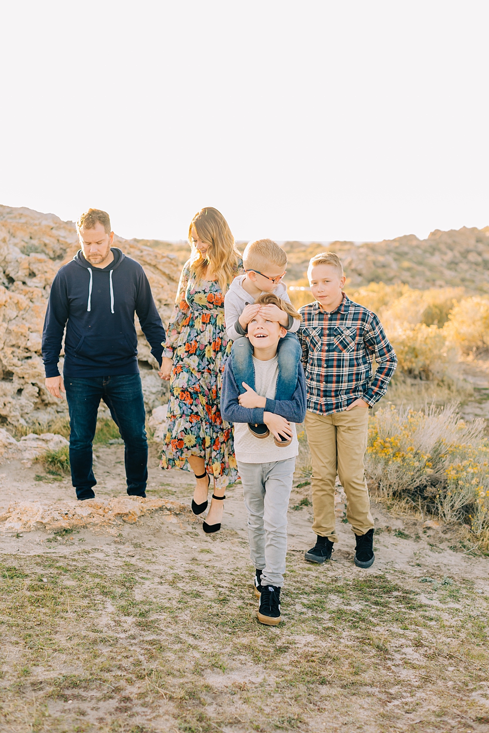 We shot this session at Lady Finger Point on Antelope Island which is right across from the visitor’s center. It’s a beautiful trailhead with parking, picnic benches, and bathrooms. But, we come for the rocks and the light. This look just can’t be beat and is the best substitute we have for beaches in Utah. Isn’t it stunning?