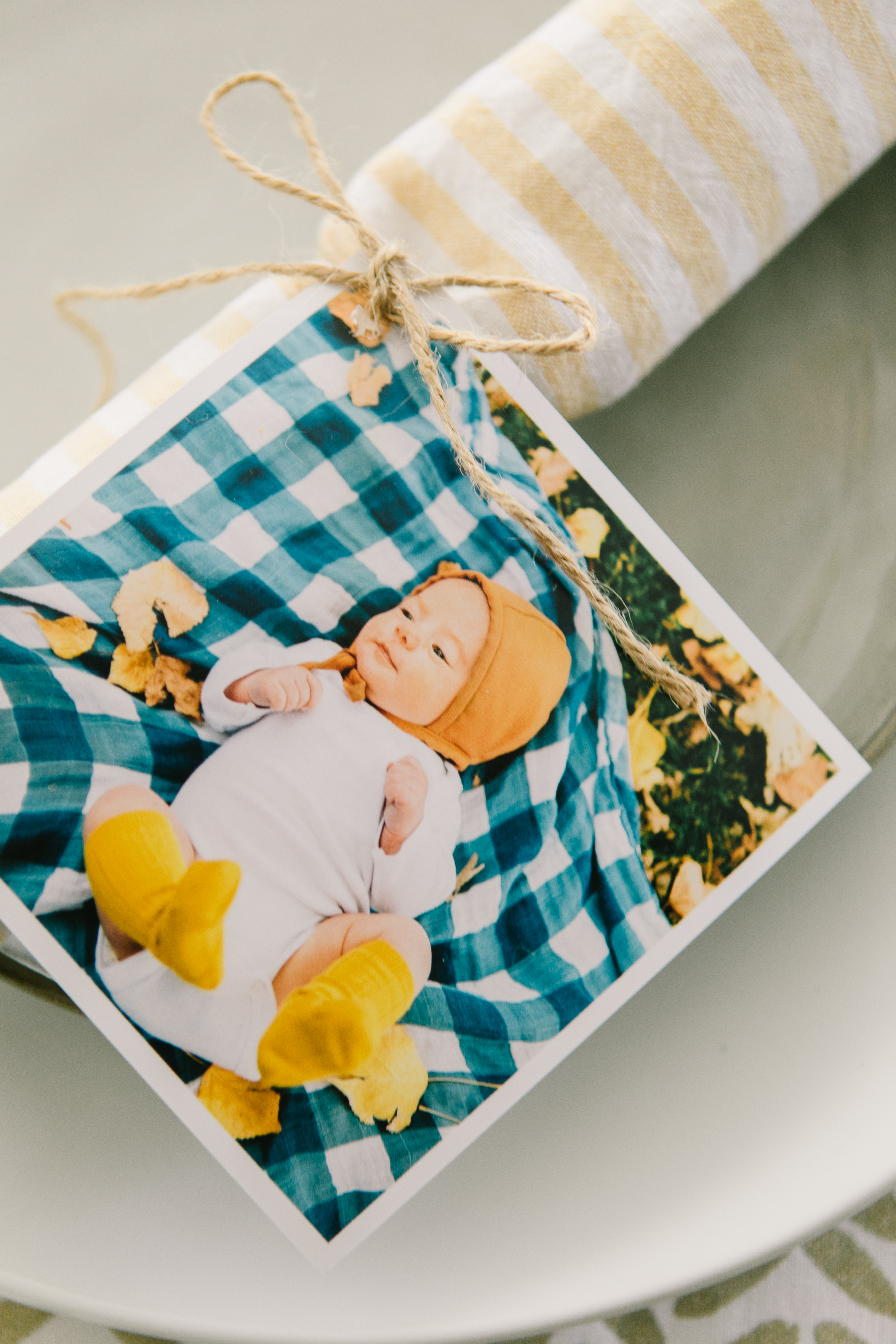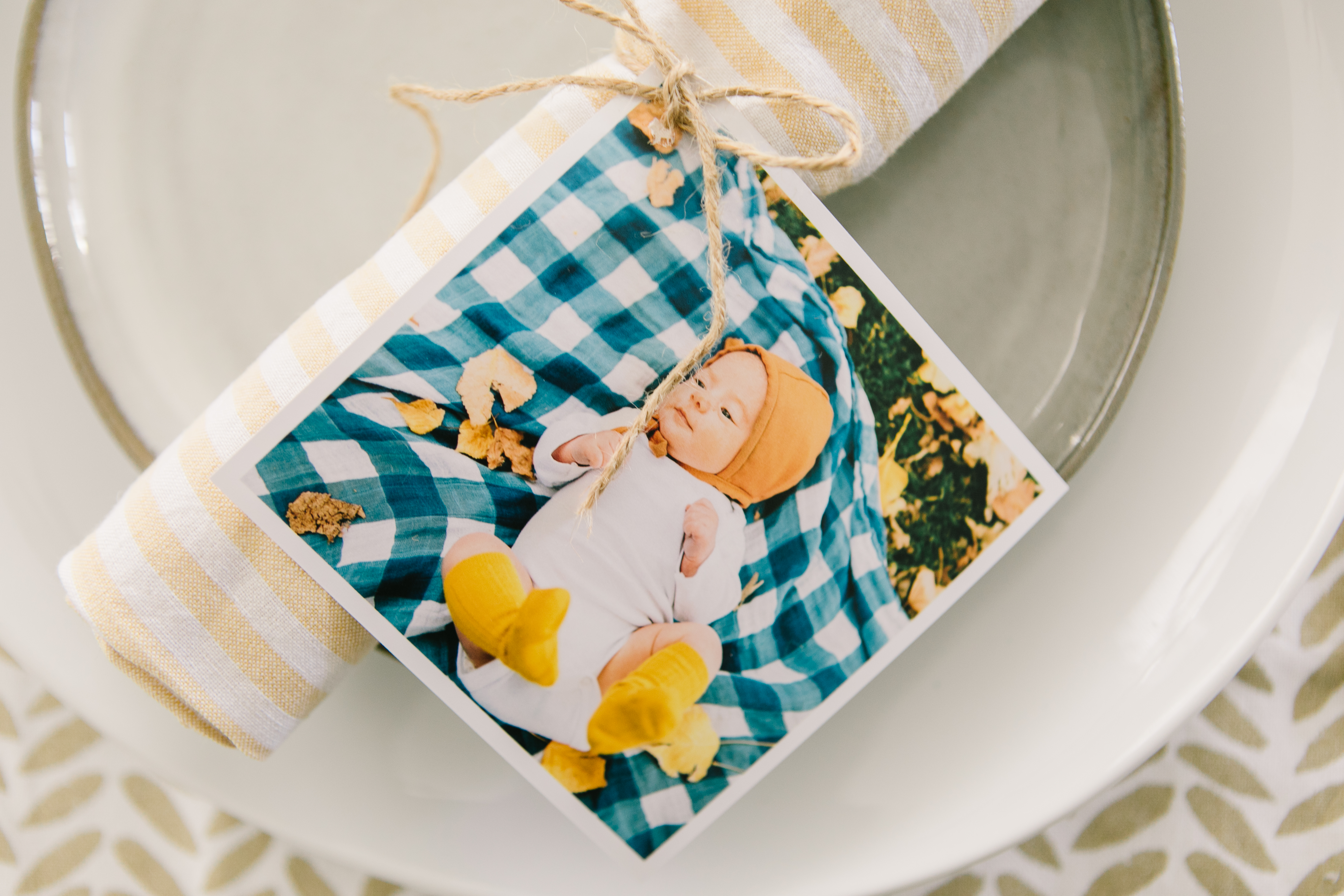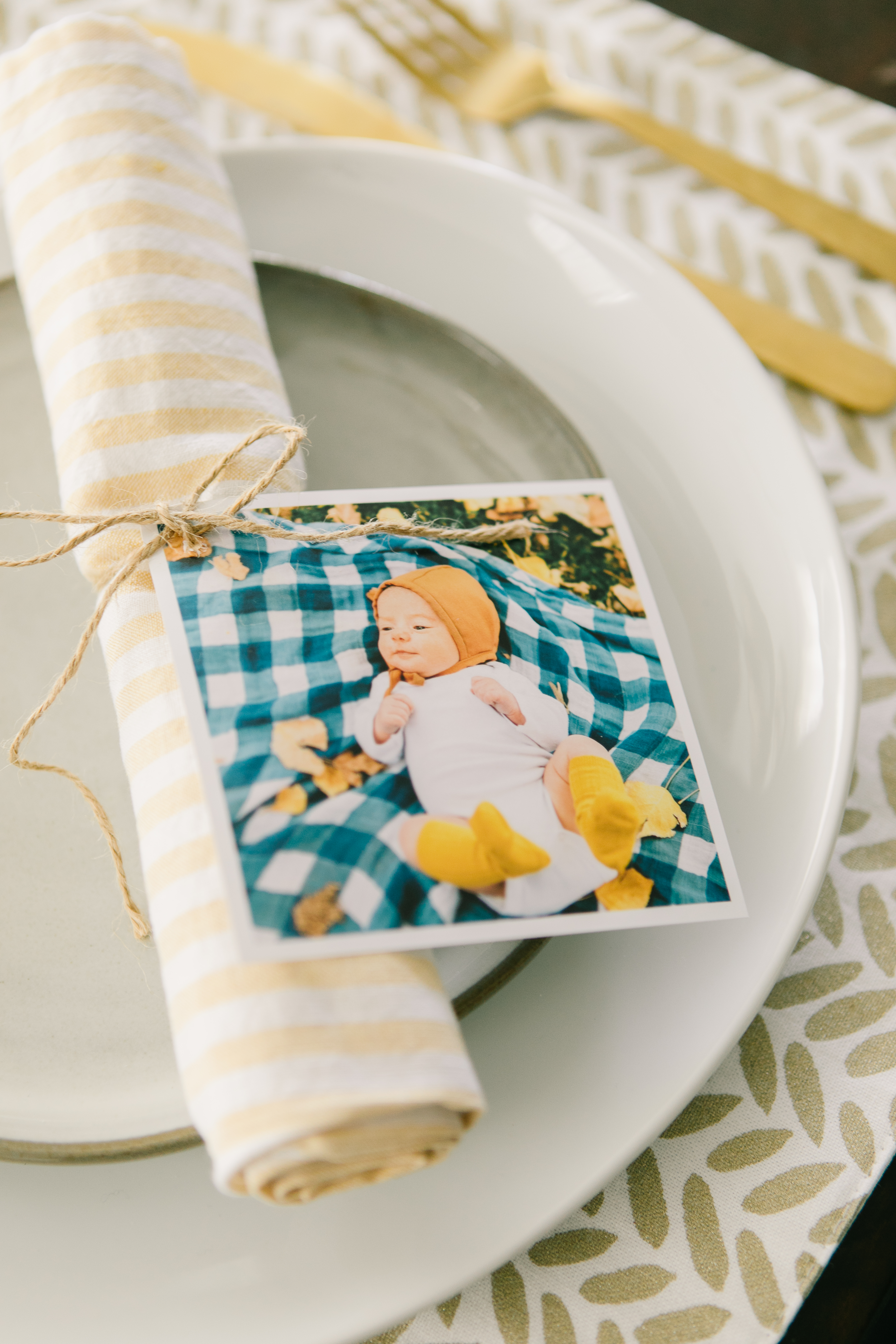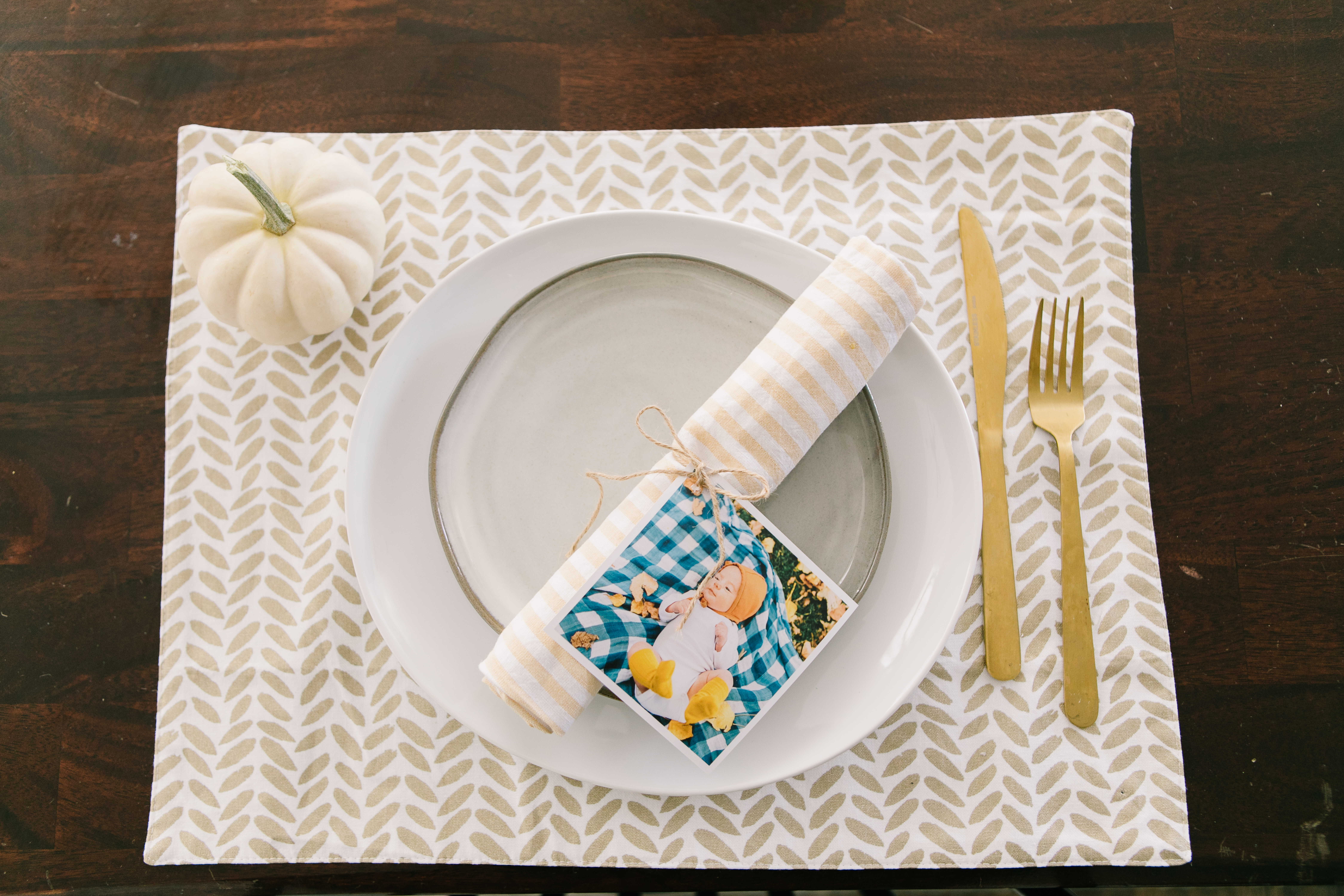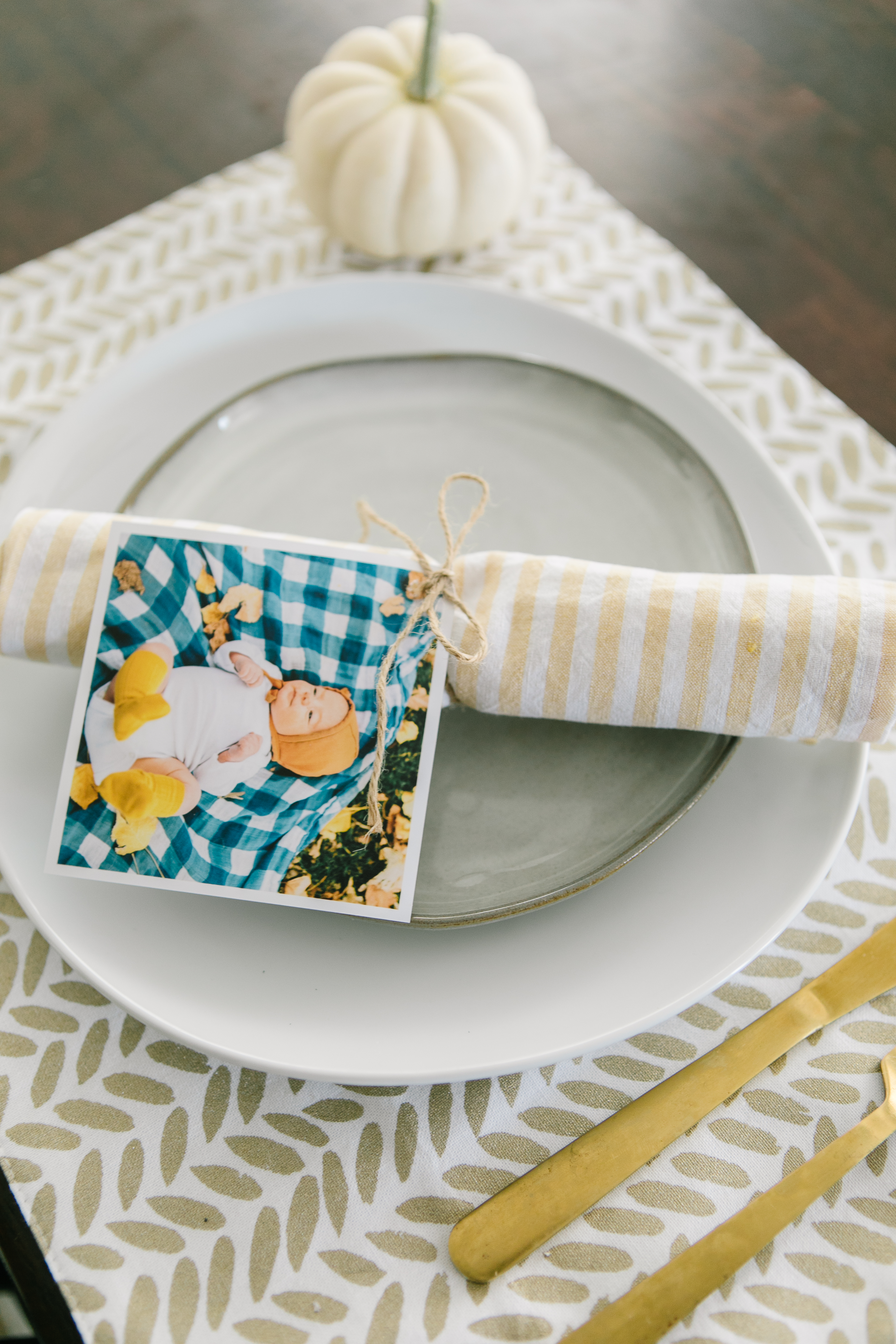 I found these darling square prints at Persnickety Prints and KNEW I needed to incorporate them into my home. I brainstormed a few ideas and adding them to my Thanksgiving place settings is my favorite! I loved the idea of incorporating moments from the year, things you are grateful for, or just darling family pictures to your place settings as a way recognize all you’re grateful for.