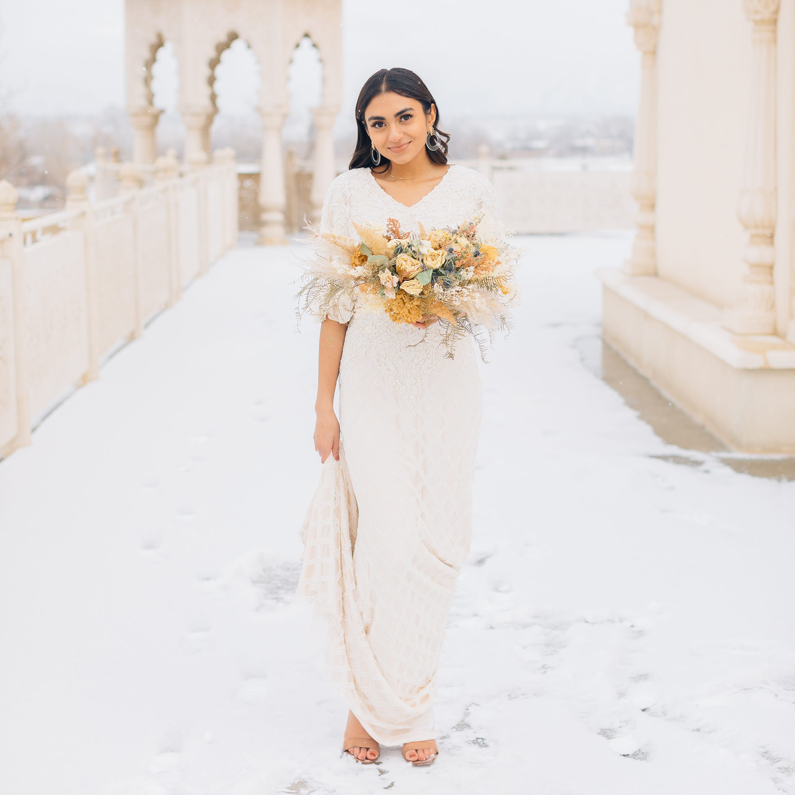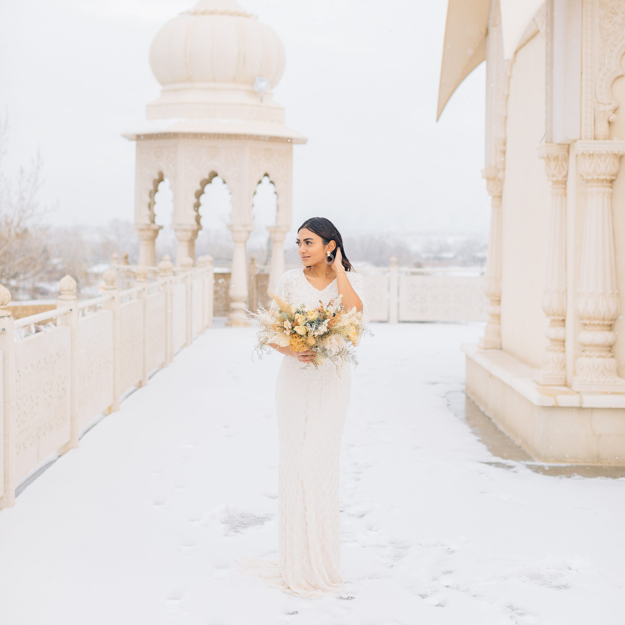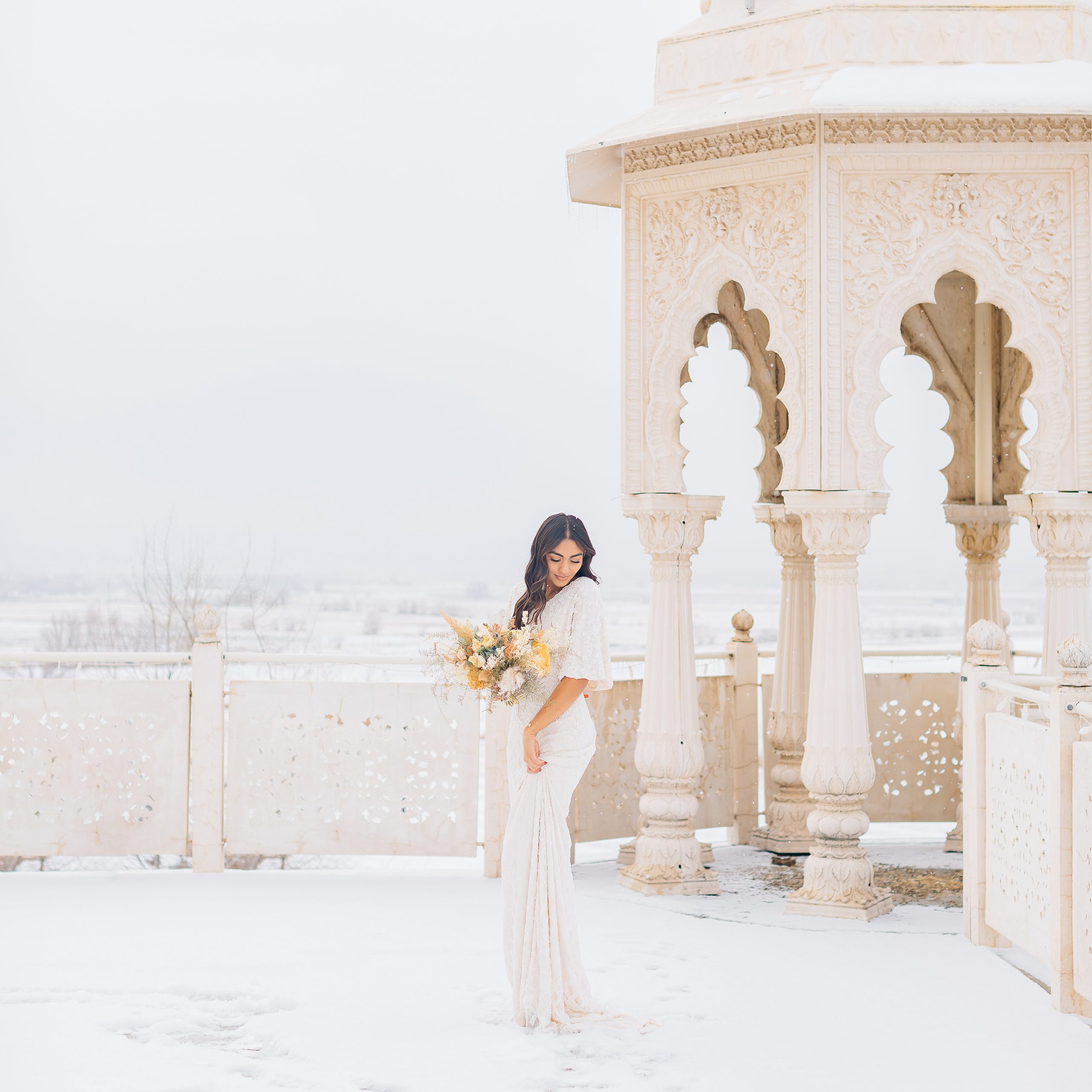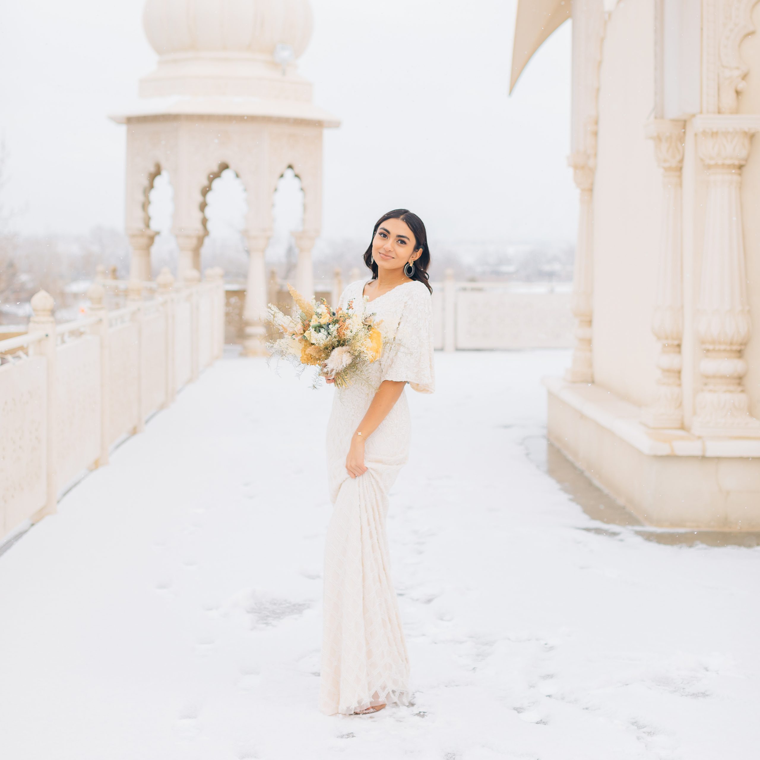 The dress for this installment of the photographer’s challenge was The Seraphina. I don’t know a ton about styles of wedding dresses or technical terms, but to me, the dress looked modern. I figured everyone would shoot in a forest or something with snow, but I wanted to shoot somewhere modern that would fit the dress. I decided on the Krishna Temple in Spanish Fork because I felt like the architecture would compliment the modern-ness of the dress perfectly.