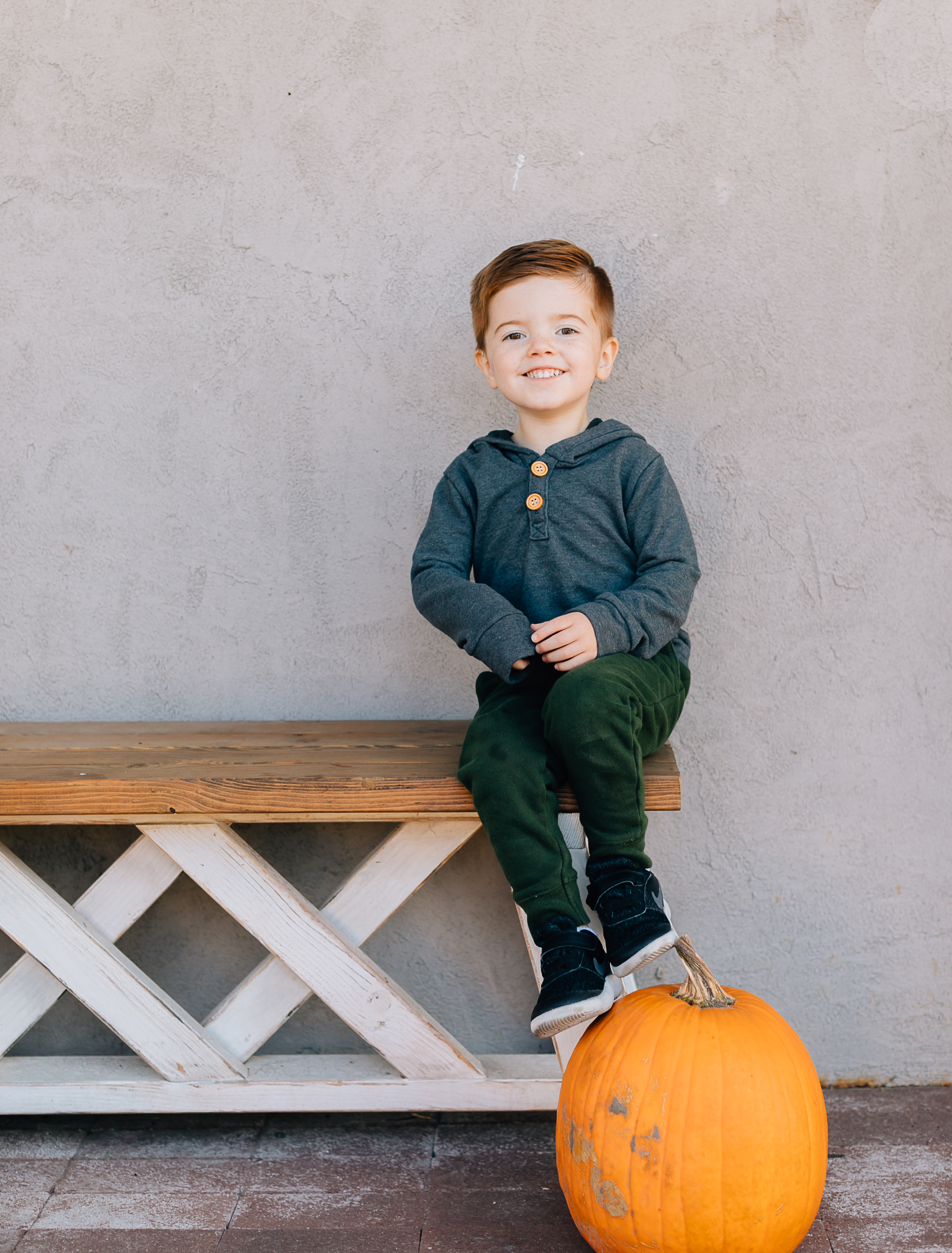 2) The gray wall in from of A Great Escape: This wall is the perfect neutral color and even has a darling bench with pumpkins in front of it!